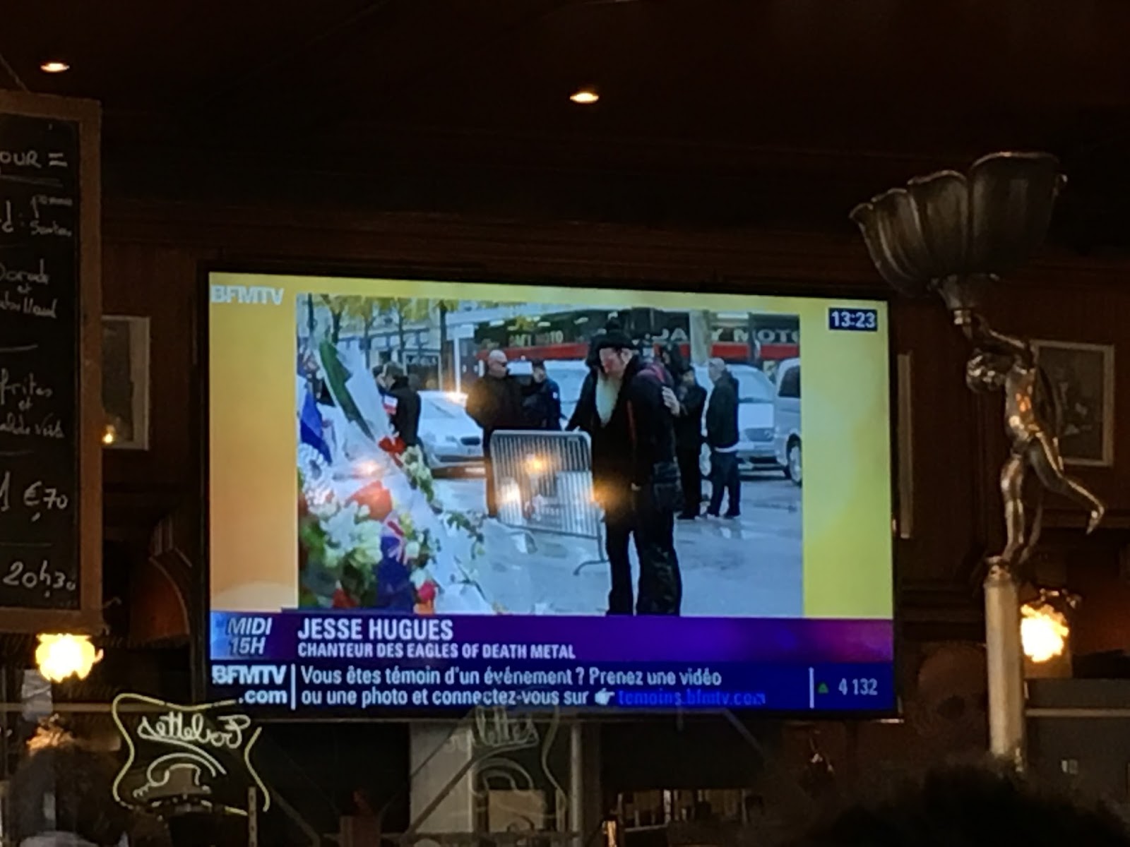 We wandered into a fancy place near the Notre Dame Cathedral for lunch and while we were seated, we couldn’t help but notice our friend Jesse Hughes on the TV, being interviewed about the Eagles of Death Metals’ return to Paris to perform for the victims and their families of the November 13th attacks later that evening. We were tickled to see him on the tele in that restaurant while eating lunch. What a great time to be in Paris. I was SO happy to be there, even more so knowing that I would be later shooting that show that evening.